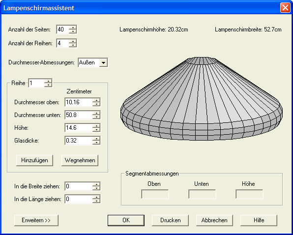 Wenn Sie die Lizenz zum Benutzen des Lampenschirmassistenten haben, können Sie Ihre Maus über einem Segment positionieren und sehen dann seine Abmessungen im Bereich „Segmentabmessungen“ in der Dialogbox. Sie können auch auf die Schaltfläche „OK“ klicken, um eine Glass Eye 2000-Zeichnung von den Segmenten zu erzeugen. Klicken Sie auf die Schaltfläche „Abbrechen“ auf dem Lampenschirmassistenten, um die Lektion zu beenden. Nächste Lektion: Arbeiten mit mehreren Entwürfen und Ansichten |