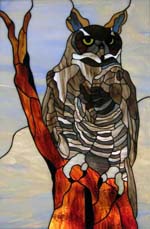 We have a great passion for wildlife, bird, western and flower panels, windows and lamps. From our attendance at various Christmas markets, farmers' markets and juried art shows in Alberta, we continued to be asked to make a great variety of stained glass items. As an example, to the right is an 18" x 27" great horned owl panel that we recently completed. The design is by Rob Torres of The Oak Tree Stained Glass in Wilmington, Delaware.