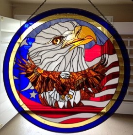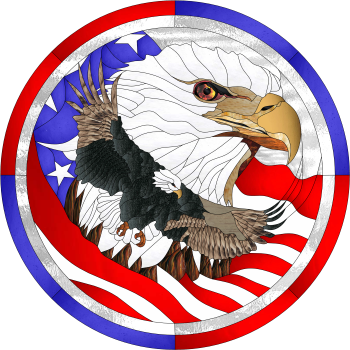 When creating a window of an animal we generally figure that if you can't see through it in actuality, use opaque glass, like fur, nose leather, etc. If you can see through it (like the eyes), use a deep cathedral color, always putting in the pupil of the eye and most importantly that glint of light that indicates "life" in the beast. Yes, these are often the smallest pieces in the window but oh so necessary for the dimensionality and personality of the panel. In this month's pattern, we were asked by a client in Utah to create an incredibly patriotic design utilizing the national bird of the USA, the bald eagle. Had we not captured the eye of the major bird, this eagle would not have that regal look. Always remember to use narrowest foil for cut lines in the eyes. Think 5/32" or even narrower.