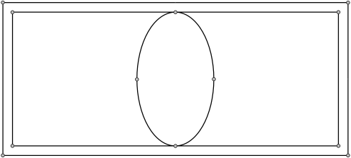 Choisissez maintenant "Ellipse" dans le menu Dessin. Dans le menu raccourci, choisissez Centre, dimensions comme méthode de dessin. En vous guidant sur le nœud que vous venez d'ajouter, cliquez sur le point de grille exactement au centre de votre dessin. (Vous pouvez probablement repérer le centre de la ligne vertical en vous servant uniquement du quadrillage. Une autre façon de trouver le centre est de trouver le point 18 pouces, 8 pouces en regardant le champs à la droite de la barre d'état). Faites ensuite une ellipse comme celle ci-dessous en cliquant avec la souris à environ quatre pouces à droite du nœud que vous venez d'ajouter avec la commande Subdiviser; il devrait s'agir du point 22 pouces, 15 pouces. Si l'ellipse n'est pas comme celle ci-dessous, cliquez sur Défaire et recommencez.